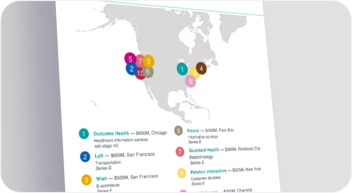 5 7 3 4 2 10 6 1 8 9 1 Outcome Health — $600M, Chicago 6 Houzz —$400M, Palo Alto Healthcare information services Information services late-stage VC Series E 2 Lyft — $600M, San Francisco 7 Guardant Health — $360M, Redwood City Transportation Biotechnology Series G Series E 3 Wish — $500M, San Francisco 8 Peloton Interactive — $325M, New York E-commerce Consumer durables Series F Series E 4 Intarcia Therapeutics — $475.7M, 9 AvidXchange — $300M, Charlotte Boston Financial software Drug discovery Series F Series EE 5 Unity — $400M, San Francisco 10 Essential Products — $300M, Palo Alto Entertainment software Electronics (B2C) late-stage VC Series B Source: Venture Pulse, Q2'17, Global Analysis of Venture Funding, KPMG Enterprise. Data provided by PitchBook, July 13, 2017. © 2017 KPMG International Cooperative (“KPMG International”). KPMG International provides no client services and is a Swiss entity with which the independent member firms of the KPMG network are affiliated. #Q2VC
