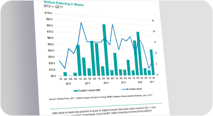 Venture financing in Mexico 2012 — Q2'17 $100.0 25 $90.0 $80.0 20 $70.0 $60.0 15 $50.0 $40.0 10 $30.0 $20.0 5 $10.0 $0.0 0 1Q 2Q 3Q 4Q 1Q 2Q 3Q 4Q 1Q 2Q 3Q 4Q 1Q 2Q 3Q 4Q 1Q 2Q 3Q 4Q 1Q 2Q 2012 2013 2014 2015 2016 2017 Capital invested ($M) # of deals closed Source: Venture Pulse, Q2'17, Global Analysis of Venture Funding, KPMG Enterprise. Data provided by PitchBook, July 13, 2017. After back-to-back slow quarters in terms of capital invested, that same metric soared in Q2’17, even though volume remained compressed. Accel-led $21 million financing of online grocery platform Cornershopwas primarily responsible for the resurgence. © 2017 KPMG International Cooperative (“KPMG International”). KPMG International provides no client services and is a Swiss entity with which the independent member firms of the KPMG network are affiliated. #Q2VC