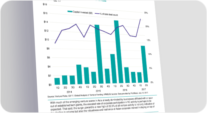 Corporate participation in venture deals in Asia 2014 — Q2'17 $18 25% Capital invested ($B) % of total deal count $16 $14 20% $12 15% $10 $8 10% $6 $4 5% $2 $0 0% 1Q 2Q 3Q 4Q 1Q 2Q 3Q 4Q 1Q 2Q 3Q 4Q 1Q 2Q 2014 2015 2016 2017 Source: Venture Pulse, Q2'17, Global Analysis of Venture Funding, KPMG Enterprise. Data provided by PitchBook, July 13, 2017. With much of the emerging venture scene in Asia already dominated by businesses affiliated with or spun out of established tech giants, the elevated rate of corporate participation in VC activity is perhaps to be expected. That said, the surge upward to a new high of 22.5% of all venture activity is not only indicative of the decline in volume but also the robustness and resilience of Asian corporate interest in staying on top of innovation. “Enhancing the overall customer experience is becoming a key driver as more developed businesses refine their business models to boost their path to profitability. Apps like food delivery and ride-share are starting to heavily invest in training staff.” Lyndon Fung US Capital Markets Group, KPMG China © 2017 KPMG International Cooperative (“KPMG International”). KPMG International provides no client services and is a Swiss entity with which the independent member firms of the KPMG network are affiliated. #Q2VC