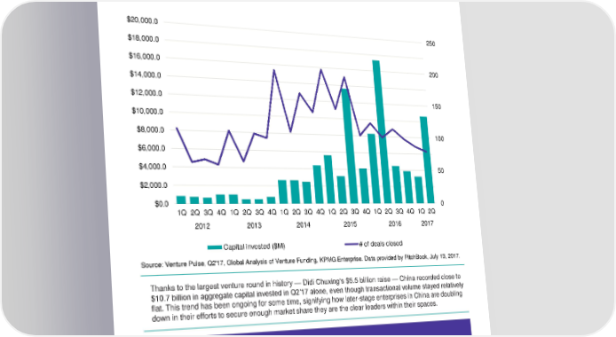Venture financing in China 2012 — Q2'17 $20,000.0 250 $18,000.0 $16,000.0 200 $14,000.0 $12,000.0 150 $10,000.0 $8,000.0 100 $6,000.0 $4,000.0 50 $2,000.0 $0.0 0 1Q 2Q 3Q 4Q 1Q 2Q 3Q 4Q 1Q 2Q 3Q 4Q 1Q 2Q 3Q 4Q 1Q 2Q 3Q 4Q 1Q 2Q 2012 2013 2014 2015 2016 2017 Capital invested ($M) # of deals closed Source: Venture Pulse, Q2'17, Global Analysis of Venture Funding, KPMG Enterprise. Data provided by PitchBook, July 13, 2017. Thanks to the largest venture round in history — Didi Chuxing’s $5.5 billion raise — China recorded close to $10.7 billion in aggregate capital invested in Q2’17 alone, even though transactional volume stayed relatively flat. This trend has been ongoing for some time, signifying how later-stage enterprises in China are doubling down in their efforts to secure enough market share they are the clear leaders within their spaces. “Increasingly, the government backed funds in China are stepping into the space of traditional VCs and making investments that support the national priorities in innovation, the priority areas include industrial automation, next generation vehicles, and new technologies in healthcare. There are also many government innovation initiatives launched over the last three quarters and we do not anticipate the pace slowing down in the near future.” Patrick Imbach Philip Ng Co-Head of KPMG Tech Growth, Partner, Head of Technology, KPMG China KPMG in the UK © 2017 KPMG International Cooperative (“KPMG International”). KPMG International provides no client services and is a Swiss entity with which the independent member firms of the KPMG network are affiliated. #Q2VC