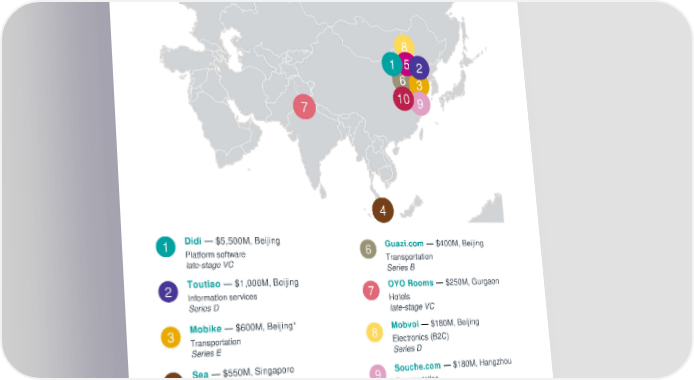 8 1 5 2 6 3 7 10 9 4 1 Didi — $5,500M, Beijing 6 Guazi.com — $400M, Beijing Platform software Transportation late-stage VC Series B 2 Toutiao — $1,000M, Beijing 7 OYO Rooms — $250M, Gurgaon Information services Hotels Series D late-stage VC 3 Mobike — $600M, Beijing* 8 Mobvoi — $180M, Beijing Transportation Electronics (B2C) Series E Series D 4 Sea — $550M, Singapore 9 Souche.com — $180M, Hangzhou Social platform software Transportation late-stage VC Series D 5 Ofo—$450M, Beijing 10 Mychebao—$174M, Nanjing Transportation Automotive Series D Series C Source: Venture Pulse, Q2'17, Global Analysis of Venture Funding, KPMG Enterprise. Data provided by PitchBook, July 13, 2017. *Note: In the prior edition of the Venture Pulse, Mobike’s Singapore location was identified as the outlet wherein its Q1’17 round was raised, given the purpose of the funds was explicitly for expansion in the Singapore and adjacent markets. This subsequent financing, as best as can be determined, is for overall purposes, hence the location is determined as Mobike’s official headquarters. © 2017 KPMG International Cooperative (“KPMG International”). KPMG International provides no client services and is a Swiss entity with which the independent member firms of the KPMG network are affiliated. #Q2VC