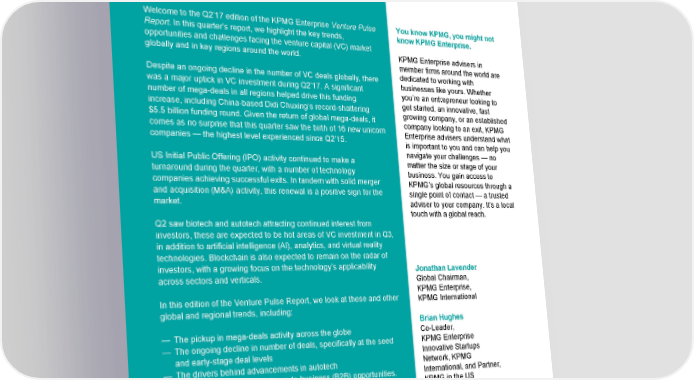 Welcome to the Q2’17 edition of the KPMG Enterprise Venture Pulse You know KPMG, you might not Report. In this quarter’s report, we highlight the key trends, know KPMG Enterprise. opportunities and challenges facing the venture capital (VC) market KPMG Enterprise advisers in globally and in key regions around the world. member firms around the world are dedicated to working with Despite an ongoing decline in the number of VC deals globally, there businesses like yours. Whether was a major uptick in VC investment during Q2’17. A significant you’re an entrepreneur looking to number of mega-deals in all regions helped drive this funding get started, an innovative, fast increase, including China-based Didi Chuxing’s record-shattering growing company, or an established $5.5 billion funding round. Given the return of global mega-deals, it company looking to an exit, KPMG comes as no surprise that this quarter saw the birth of 16 new unicorn Enterprise advisers understand what companies — the highest level experienced since Q2’15. is important to you and can help you navigate your challenges — no US Initial Public Offering (IPO) activity continued to make a matter the size or stage of your turnaround during the quarter, with a number of technology business. You gain access to companies achieving successful exits. In tandem with solid merger KPMG’s global resources through a and acquisition (M&A) activity, this renewal is a positive sign for the single point of contact — a trusted market. adviser to your company. It’s a local touch with a global reach. Q2 saw biotech and autotech attracting continued interest from investors, these are expected to be hot areas of VC investment in Q3, in addition to artificial intelligence (AI), analytics, and virtual reality technologies. Blockchain is also expected to remain on the radar of investors, with a growing focus on the technology’s applicability Jonathan Lavender across sectors and verticals. Global Chairman, KPMG Enterprise, In this edition of the Venture Pulse Report, we look at these and other KPMG International global and regional trends, including: Brian Hughes —The pickup in mega-deals activity across the globe Co-Leader, KPMG Enterprise —The ongoing decline in number of deals, specifically at the seed Innovative Startups and early-stage deal levels Network, KPMG —The drivers behind advancements in autotech International, and Partner, —The growing focus on business to business (B2B) opportunities. KPMG in the US We hope you find this edition of the Venture Pulse Report insightful. If Arik Speier you would like to discuss any of the results in more detail, please Co-Leader, contact a KPMG adviser in your area. KPMG Enterprise Innovative Startups Network, KPMG International, and Partner, KPMG in Israel © 2017 KPMG International Cooperative (“KPMG International”). KPMG International provides no client © 2017 KPMG International Cooperative (“KPMG International”). KPMG International provides no client services and is a Swiss entity with which the independent member firms of the KPMG network are affiliated. services and is a Swiss entity with which the independent member firms of the KPMG network are affiliated. #Q2VC