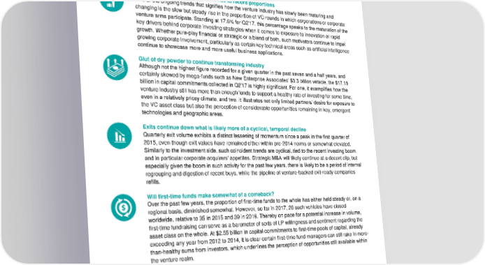 Corporate participation continues rise to record proportions One of the ongoing trends that signifies how the venture industry has slowly been maturing and changing is the slow but steady rise in the proportion of VC rounds in which corporations or corporate venture arms participate. Standing at 17.6% for Q2'17, this percentage speaks to the maturation of the key drivers behind corporate investing strategies when it comes to exposure to innovation or rapid growth. Whether pure-play financial or strategic or a blend of both, such motivators continue to impel growing corporate involvement, particularly as certain key technical areas such as artificial intelligence continue to showcase more and more useful business applications. Glut of dry powder to continue transforming industry Although not the highest figure recorded for a given quarter in the past seven and a half years, and certainly skewed by mega-funds such as New Enterprise Associates’ $3.3 billion vehicle, the $17.15 billion in capital commitments collected in Q2'17 is highly significant. For one, it exemplifies how the venture industry still has more than enough funds to support a healthy rate of investing for some time, even in a relatively pricey climate, and two, it illustrates not only limited partners’ desire for exposure to the VC asset class but also the perception of considerable opportunities remaining in key, emergent technologies and geographic areas. Exits continue down what is likely more of a cyclical, temporal decline Quarterly exit volume exhibits a distinct lessening of momentum since a peak in the first quarter of 2015, even though exit values have remained either within pre-2014 norms or somewhat elevated. Similarly to the investment side, such coincident trends are cyclical, tied to the recent investing boom and in particular corporate acquirers’ appetites. Strategic M&A will likely continue at a decent clip, but especially given the boom in such activity for the past few years, there is likely to be a period of internal regrouping and digestion of recent buys, while the pipeline of venture-backed exit-ready companies refills. Will first-time funds make somewhat of a comeback? Over the past few years, the proportion of first-time funds to the whole has either held steady or, on a regional basis, diminished somewhat. However, so far in 2017, 26 such vehicles have closed worldwide, relative to 35 in 2015 and 39 in 2016. Thereby on pace for a potential increase in volume, first-time fundraising can serve as a barometer of sorts of LP willingness and sentiment regarding the asset class on the whole. At $2.55 billion in capital commitments to first-time pools of capital, already exceeding any year from 2012 to 2014, it is clear certain first-time fund managers can still rake in more- than-healthy sums from investors, which underlines the perception of opportunities still available within the venture realm. All currency amounts are in USD, unless otherwise specified, data provided by PitchBook. © 2017 KPMG International Cooperative (“KPMG International”). KPMG International provides no client services and is a Swiss entity with which the independent member firms of the KPMG network are affiliated. #Q2VC