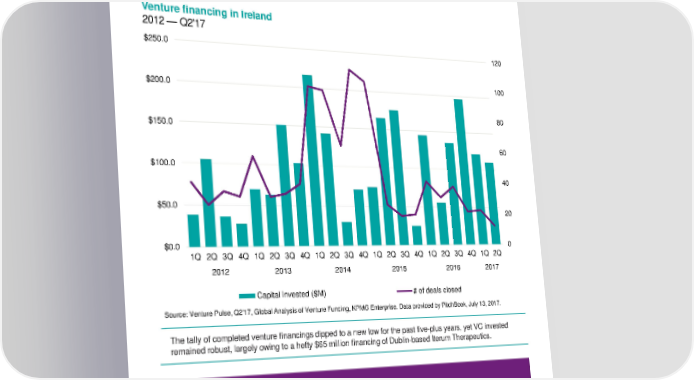 Venture financing in Ireland 2012 — Q2'17 $250.0 120 $200.0 100 80 $150.0 60 $100.0 40 $50.0 20 $0.0 0 1Q 2Q 3Q 4Q 1Q 2Q 3Q 4Q 1Q 2Q 3Q 4Q 1Q 2Q 3Q 4Q 1Q 2Q 3Q 4Q 1Q 2Q 2012 2013 2014 2015 2016 2017 Capital invested ($M) # of deals closed Source: Venture Pulse, Q2'17, Global Analysis of Venture Funding, KPMG Enterprise. Data provided by PitchBook, July 13, 2017. The tally of completed venture financings dipped to a new low for the past five-plus years, yet VC invested remained robust, largely owing to a hefty $65 million financing of Dublin-based Iterum Therapeutics. “Ireland is not just keen to be attractive to startups, but it is also keen to provide a conducive environment in which to grow and scale international companies. TechIreland, which is currently mapping deep engineering and R&D activities aims to become the definitive source of data and insights on Irish innovation globally. This initiative will help shine a spotlight on a number of companies which should ultimately enable them to gain visibility and stronger prospects to attract funding.” Anna Scally Partner, Head of Technology, and Media and Fintech Lead, KPMG in Ireland © 2017 KPMG International Cooperative (“KPMG International”). KPMG International provides no client services and is a Swiss entity with which the independent member firms of the KPMG network are affiliated. #Q2VC