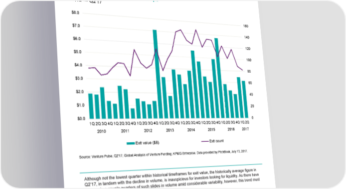 Venture-backed exit activity in Europe 2010 — Q2'17 $8.0 160 $7.0 140 $6.0 120 $5.0 100 $4.0 80 $3.0 60 $2.0 40 $1.0 20 $0.0 0 1Q2Q3Q4Q1Q2Q3Q4Q1Q2Q3Q4Q1Q2Q3Q4Q1Q2Q3Q4Q1Q2Q3Q4Q1Q2Q3Q4Q1Q2Q 2010 2011 2012 2013 2014 2015 2016 2017 Exit value ($B) Exit count Source: Venture Pulse, Q2'17, Global Analysis of Venture Funding, KPMG Enterprise. Data provided by PitchBook, July 13, 2017. Although not the lowest quarter within historical timeframes for exit value, the historically average figure in Q2’17, in tandem with the decline in volume, is inauspicious for investors looking for liquidity. As there have been only a couple quarters of such slides in volume amid considerable variability, however, this trend must be monitored going forward for greater validation. © 2017 KPMG International Cooperative (“KPMG International”). KPMG International provides no client services and is a Swiss entity with which the independent member firms of the KPMG network are affiliated. #Q2VC