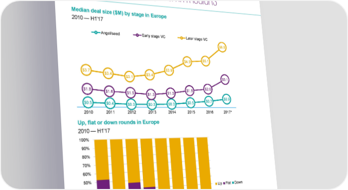 Median deal size ($M) by stage in Europe 2010 — H1'17 Angel/seed Early stage VC Later stage VC $6.8 $5.1 $4.9 $3.9 $3.7 $3.4 $3.4 $3.1 $3.1 $2.0 $1.8 $1.8 $1.6 $1.5 $1.5 $1.3 $0.9 $0.7 $0.5 $0.5 $0.4 $0.3 $0.3 $0.3 2010 2011 2012 2013 2014 2015 2016 2017* Up, flat or down rounds in Europe 2010 — H1'17 100% 90% 80% 70% 60% 50% 40% Up Flat Down 30% 20% 10% 0% 0 1 2 3 4 5 6 * 1 1 1 1 1 1 1 7 0 0 0 0 0 0 0 1 2 2 2 2 2 2 2 0 2 Source: Venture Pulse, Q2'17, Global Analysis of Venture Funding, KPMG Enterprise. *As of 6/30/2017. Data provided by PitchBook, July 13, 2017. © 2017 KPMG International Cooperative (“KPMG International”). KPMG International provides no client services and is a Swiss entity with which the independent member firms of the KPMG network are affiliated. #Q2VC
