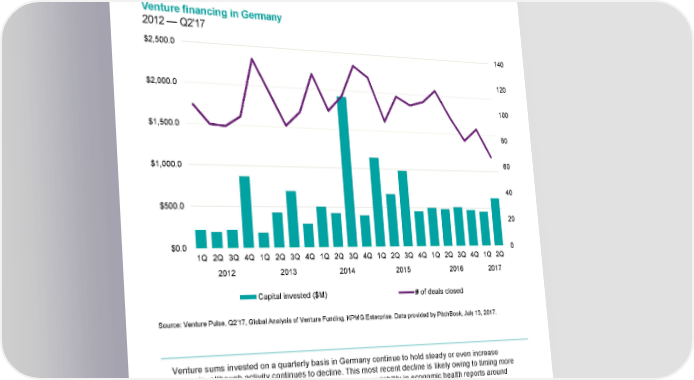 Venture financing in Germany 2012 — Q2'17 $2,500.0 140 120 $2,000.0 100 $1,500.0 80 60 $1,000.0 40 $500.0 20 $0.0 0 1Q 2Q 3Q 4Q 1Q 2Q 3Q 4Q 1Q 2Q 3Q 4Q 1Q 2Q 3Q 4Q 1Q 2Q 3Q 4Q 1Q 2Q 2012 2013 2014 2015 2016 2017 Capital invested ($M) # of deals closed Source: Venture Pulse, Q2'17, Global Analysis of Venture Funding, KPMG Enterprise. Data provided by PitchBook, July 13, 2017. Venture sums invested on a quarterly basis in Germany continue to hold steady or even increase upwards, although activity continues to decline. This most recent decline is likely owing to timing more than anything else, although political uncertainty or the variability in economic health reports around the continent on the whole will likely continue to impact investor sentiment. © 2017 KPMG International Cooperative (“KPMG International”). KPMG International provides no client services and is a Swiss entity with which the independent member firms of the KPMG network are affiliated. #Q2VC
