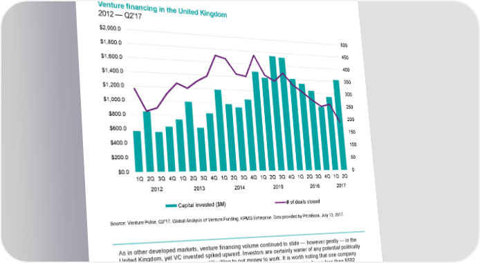Venture financing in the United Kingdom 2012 — Q2'17 $2,000.0 500 $1,800.0 450 $1,600.0 400 $1,400.0 350 $1,200.0 300 $1,000.0 250 $800.0 200 $600.0 150 $400.0 100 $200.0 50 $0.0 0 1Q 2Q 3Q 4Q 1Q 2Q 3Q 4Q 1Q 2Q 3Q 4Q 1Q 2Q 3Q 4Q 1Q 2Q 3Q 4Q 1Q 2Q 2012 2013 2014 2015 2016 2017 Capital invested ($M) # of deals closed Source: Venture Pulse, Q2'17, Global Analysis of Venture Funding, KPMG Enterprise. Data provided by PitchBook, July 13, 2017. As in other developed markets, venture financing volume continued to slide — however gently — in the United Kingdom, yet VC invested spiked upward. Investors are certainly warier of any potential politically related uncertainties, yet they are still willing to put money to work. It is worth noting that one company alone — virtual gaming operating system maker Improbable — was responsible for no less than $502 million raised. © 2017 KPMG International Cooperative (“KPMG International”). KPMG International provides no client services and is a Swiss entity with which the independent member firms of the KPMG network are affiliated. #Q2VC