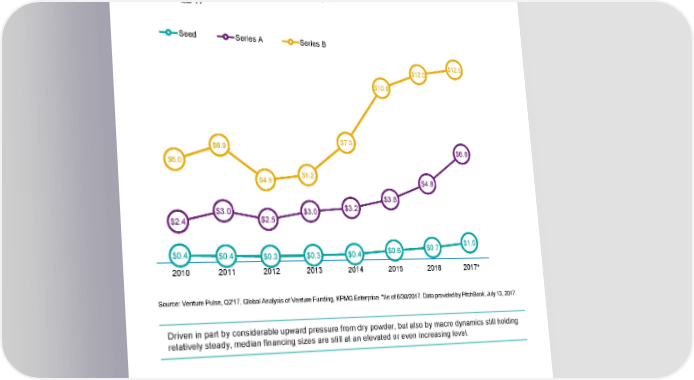 Median deal size ($M) by series in Europe 2010 — Q2'17 Seed Series A Series B $12.5 $12.0 $10.9 $7.3 $6.9 $6.8 $6.0 $5.2 $4.9 $4.8 $3.8 $3.2 $3.0 $3.0 $2.5 $2.4 $1.0 $0.7 $0.6 $0.4 $0.4 $0.4 $0.3 $0.3 2010 2011 2012 2013 2014 2015 2016 2017* Source: Venture Pulse, Q2'17, Global Analysis of Venture Funding, KPMG Enterprise. *As of 6/30/2017. Data provided by PitchBook, July 13, 2017. Driven in part by considerable upward pressure from dry powder, but also by macro dynamics still holding relatively steady, median financing sizes are still at an elevated or even increasing level. © 2017 KPMG International Cooperative (“KPMG International”). KPMG International provides no client services and is a Swiss entity with which the independent member firms of the KPMG network are affiliated. #Q2VC