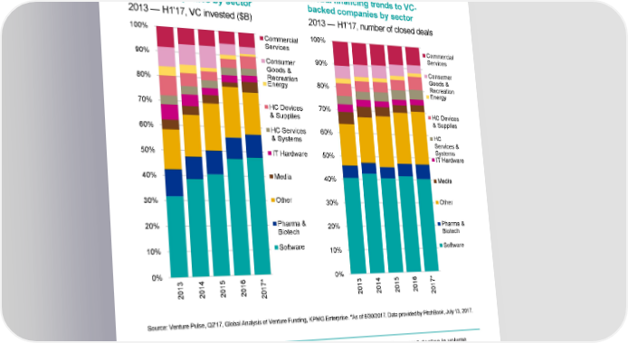 Global financing trends to VC- Global financing trends to VC- backedcompanies by sector backedcompanies by sector 2013 — H1'17, VC invested ($B) 2013 — H1'17, number of closed deals 100% 100% Commercial Commercial Services Services 90% 90% Consumer Consumer Goods & Goods & Recreation 80% Recreation 80% Energy Energy 70% HC Devices 70% HC Devices & Supplies & Supplies 60% HC Services 60% HC & Systems Services & Systems 50% IT Hardware 50% IT Hardware 40% Media 40% Media 30% Other 30% Other Pharma & 20% Pharma & 20% Biotech Biotech Software 10% Software 10% 0% 0% 3 4 5 6 * 7 3 5 6 * 1 1 1 1 7 0 0 0 0 1 1 14 1 1 0 0 0 0 1 2 2 2 2 0 2 2 20 2 2 2 Source: Venture Pulse, Q2'17, Global Analysis of Venture Funding, KPMG Enterprise. *As of 6/30/2017. Data provided by PitchBook, July 13, 2017. Analyzing the pace of financings by sector compared to those of 2016, amid the overall decline in volume, healthcare, pharmaceuticals and biotechnology companies are still closing a relatively strong number of deals in aggregate. The proportion of healthcare-related deal volume grew from 14.4% of the total in 2016 to 16.9% of overall volume in the first half of 2017. © 2017 KPMG International Cooperative (“KPMG International”). KPMG International provides no client services and is a Swiss entity with which the independent member firms of the KPMG network are affiliated. #Q2VC