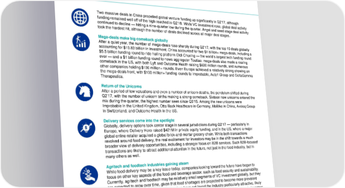 Two massive deals in China propelled global venture funding up significantly in Q2’17, although funding remained well off of the high reached in Q2’16. While VC investment rose, global deal activity continued to decline — hitting a nine-quarter low during the quarter. Angel and seed stage deal activity took the hardest hit, although the number of deals declined across all major deal stages. Mega-deals make big comeback globally After a quiet year, the number of mega-deals rose sharply during Q2’17, with the top 10 deals globally accounting for $10.83 billion in investment. China accounted for two $1 billion+ mega-deals, including a $5.5 billion funding round to ride hailing platform Didi Chuxing — the world’s largest tech funding round ever —and a $1 billion funding round to news aggregator Toutiao. mega-deals also made a roaring comeback in the US, with both Lyft and Outcome Health raising $600 million rounds, and numerous other companies holding $100 million+ rounds. Even Europe achieved a relatively strong showing on the mega-deals front, with $100 million+ funding rounds to Improbable, Auto1 Group and DeltaGamma Therapeutics. Return of the Unicorns After a period of low valuations and even a number of unicorn deaths, the pendulum shifted during Q2’17, with the number of unicorn births making a strong comeback. Sixteen new unicorns entered the mix during the quarter, the highest number seen since Q3’15. Among the new unicorns were Improbable in the United Kingdom, Otto Bock Healthcare in Germany, MoBike in China, Avoloq Group in Switzerland, and Outcome Health in the US. Delivery services come into the spotlight Globally, delivery options took center stage in several jurisdictions during Q2’17 — particularly in Europe, where Delivery Hero raised $421M in private equity funding, and in the US, where a major global online retailer acquired a global brick-and-mortar grocery chain. While both transactions revolved around food delivery, the real excitement for investors may be in the shift towards a much broader view of delivery opportunities, including a stronger focus on B2B services. Such B2B-focused transactions are likely to attract additional attention in the future, not just in the food industry, but in many others as well. Agritech and foodtech industries gaining steam While food delivery may be a key issue today, companies looking toward the future have begun to focus on other key aspects of the food and beverage sector, such as food security and sustainability. Currently, agritech and foodtech may be relatively small segments of VC investment globally, but they are expected to grow over time, given that food shortages are projected to become more prevalent over time. Historically, traditional VC investors have not found the industry particularly attractive, likely as a result of the funds required and the inability to envision strong exits. However, corporate investors are beginning to take notice of the potential offered by agritech and foodtech as they look to leverage innovative technologies in their own operations and supply chains. © 2017 KPMG International Cooperative (“KPMG International”). KPMG International provides no client services and is a Swiss entity with which the independent member firms of the KPMG network are affiliated. #Q2VC