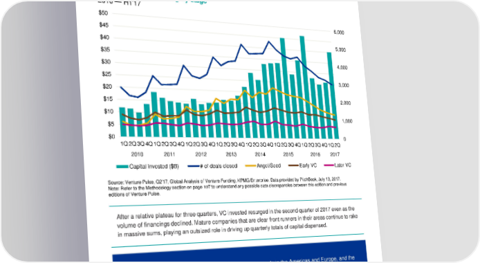 Global venture financing by stage 2010 — H1'17 $50 6,000 $45 $40 5,000 $35 4,000 $30 $25 3,000 $20 $15 2,000 $10 1,000 $5 $0 0 1Q2Q3Q4Q1Q2Q3Q4Q1Q2Q3Q4Q1Q2Q3Q4Q1Q2Q3Q4Q1Q2Q3Q4Q1Q2Q3Q4Q1Q2Q 2010 2011 2012 2013 2014 2015 2016 2017 Capital invested ($B) # of deals closed Angel/Seed Early VC Later VC Source: Venture Pulse, Q2'17, Global Analysis of Venture Funding, KPMG Enterprise. Data provided by PitchBook, July 13, 2017. Note: Refer to the Methodology section on page 107 to understand any possible data discrepancies between this edition and previous editions of Venture Pulse. After a relative plateau for three quarters, VC invested resurged in the second quarter of 2017 even as the volume of financings declined. Mature companies that are clear front runners in their areas continue to rake in massive sums, playing an outsized role in driving up quarterly totals of capital dispensed. “With two massive deals in China, significant mega-rounds in the Americas and Europe, and the birth of numerous new unicorns – VC investment rebounded globally this quarter. While global deal volume may have declined, there are many positive signs that the VC market has reached a positive turning point.” Jonathan Lavender Global Chairman, KPMG Enterprise, KPMG International © 2017 KPMG International Cooperative (“KPMG International”). KPMG International provides no client services and is a Swiss entity with which the independent member firms of the KPMG network are affiliated. #Q2VC