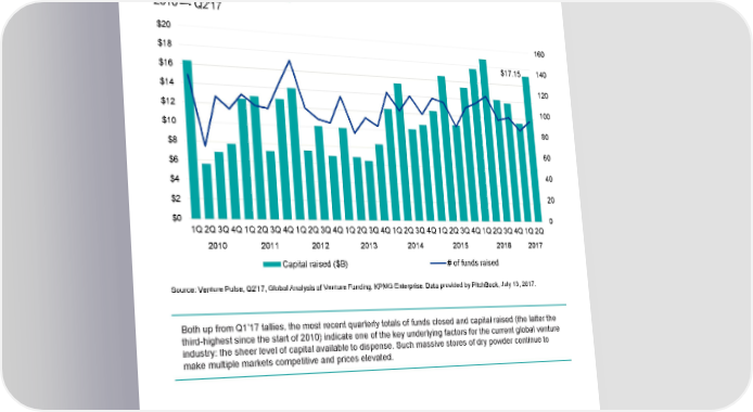 Global venture fundraising 2010 — Q2'17 $20 160 $18 140 $17.15 $16 120 $14 100 $12 $10 80 $8 60 $6 40 $4 20 $2 $0 0 1Q2Q3Q4Q1Q2Q3Q4Q1Q2Q3Q4Q1Q2Q3Q4Q1Q2Q3Q4Q1Q2Q3Q4Q1Q2Q3Q4Q1Q2Q 2010 2011 2012 2013 2014 2015 2016 2017 Capital raised ($B) # of funds raised Source: Venture Pulse, Q2'17, Global Analysis of Venture Funding, KPMG Enterprise. Data provided by PitchBook, July 13, 2017. Both up from Q1’17 tallies, the most recent quarterly totals of funds closed and capital raised (the latter the third-highest since the start of 2010) indicate one of the key underlying factors for the current global venture industry: the sheer level of capital available to dispense. Such massive stores of dry powder continue to make multiple markets competitive and prices elevated. © 2017 KPMG International Cooperative (“KPMG International”). KPMG International provides no client services and is a Swiss entity with which the independent member firms of the KPMG network are affiliated. #Q2VC