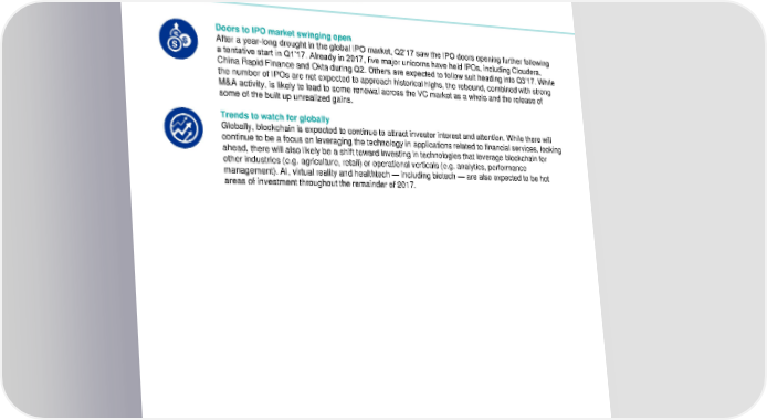 Doors to IPO market swinging open After a year-long drought in the global IPO market, Q2’17 saw the IPO doors opening further following a tentative start in Q1’17. Already in 2017, five major unicorns have held IPOs, including Cloudera, China Rapid Finance and Okta during Q2. Others are expected to follow suit heading into Q3’17. While the number of IPOs are not expected to approach historical highs, the rebound, combined with strong M&A activity, is likely to lead to some renewal across the VC market as a whole and the release of some of the built up unrealized gains. Trends to watch for globally Globally, blockchain is expected to continue to attract investor interest and attention. While there will continue to be a focus on leveraging the technology in applications related to financial services, looking ahead, there will also likely be a shift toward investing in technologies that leverage blockchain for other industries (e.g. agriculture, retail) or operational verticals (e.g. analytics, performance management). AI, virtual reality and healthtech — including biotech — are also expected to be hot areas of investment throughout the remainder of 2017. © 2017 KPMG International Cooperative (“KPMG International”). KPMG International provides no client services and is a Swiss entity with which the independent member firms of the KPMG network are affiliated. #Q2VC