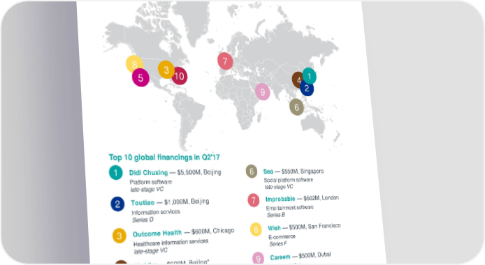 8 7 5 3 10 4 1 9 2 6 Top 10 global financings in Q2'17 1 Didi Chuxing — $5,500M, Beijing 6 Sea — $550M, Singapore Platform software Social platform software late-stage VC late-stage VC 2 Toutiao — $1,000M, Beijing 7 Improbable — $502M, London Information services Entertainment software Series D Series B 3 Outcome Health — $600M, Chicago 8 Wish — $500M, San Francisco Healthcare information services E-commerce late-stage VC Series F 4 Mobike — $600M, Beijing* 9 Careem —$500M, Dubai Transportation Transportation Series E Series E 5 Lyft — $600M, San Francisco 10 Intarcia Therapeutics — $475.7M, Boston Transportation Drug discovery Series G Series EE Source: Venture Pulse, Q2'17, Global Analysis of Venture Funding, KPMG Enterprise. Data provided by PitchBook, July 13, 2017. *Note: In the prior edition of the Venture Pulse, Mobike’s Singapore location was identified as the outlet wherein its Q1’17 round was raised, given the purpose of the funds was explicitly for expansion in the Singapore and adjacent markets. This subsequent financing, as best as can be determined, is for overall purposes, hence the location is determined as Mobike’s official headquarters. © 2017 KPMG International Cooperative (“KPMG International”). KPMG International provides no client services and is a Swiss entity with which the independent member firms of the KPMG network are affiliated. #Q2VC