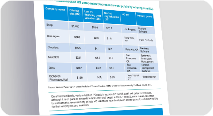 Select venture-backed US companies that recently went public by offering size ($M) Company name Offering Last VC Market HQ city Industry group size ($M) financing post- capitalization valuation ($B) ($B) Snap $3,400 $20.0 $20.7 Los Angeles Platform Software Blue Apron $300 $2.0 $1.8 New York, Food Products NY Cloudera $225 $4.1 $2.1 Palo Alto, CA Database Software San Systems & MuleSoft $221 $1.5 $3.2 Francisco, Information CA Management San Network Okta $187 $1.2 $2.1 Francisco, Management CA Software Biohaven $168 N/A $.93 New Haven, Biotechnology Pharmaceutical CT Source: Venture Pulse, Q2'17, Global Analysis of Venture Funding, KPMG Enterprise. Data provided by PitchBook, July 13, 2017. On a historical basis, venture-backed IPO activity recorded in the US is still well below recent levels, although it is on pace to exceed the lackluster total logged in 2016. That said, some mature, late-stage businesses that received hefty private VC valuations have finally been able to go public and obtain liquidity for their employees and investors. “Over the last 12 months, we have seen secondary transactions become more prevalent. Companies are using fundraises to provide some liquidity to founders and other shareholders in order to alleviate some of the pressure to go public. This is having a positive impact on the market as companies can better time their entry into the public market which should increase the quality of the public offering.” Conor Moore National Co-Lead Partner, KPMG Venture Capital Practice, KPMG in the US © 2017 KPMG International Cooperative (“KPMG International”). KPMG International provides no client services and is a Swiss entity with which the independent member firms of the KPMG network are affiliated. #Q2VC