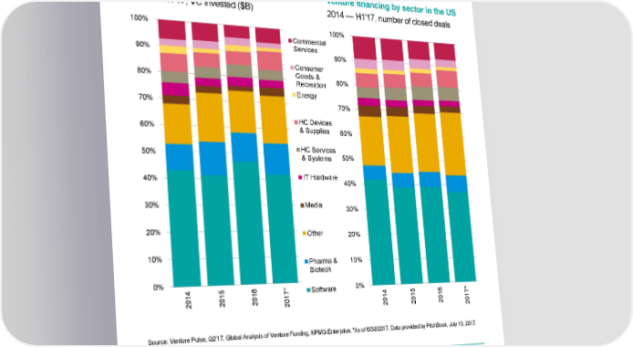 Venture financing by sector in the US Venture financing by sector in the US 2014 — H1'17, VC invested ($B) 2014 — H1'17, number of closed deals 100% 100% Commercial Services 90% 90% Consumer Goods & 80% 80% Recreation Energy 70% 70% HC Devices 60% & Supplies 60% HC Services 50% & Systems 50% IT Hardware 40% 40% 30% Media 30% 20% Other 20% 10% Pharma & 10% Biotech 0% 4 5 6 * 0% 7 Software 1 1 1 4 5 6 * 0 0 0 1 7 0 1 1 1 2 2 2 0 0 0 1 2 0 2 2 2 2 Source: Venture Pulse, Q2'17, Global Analysis of Venture Funding, KPMG Enterprise. *As of 6/30/2017. Data provided by PitchBook, July 13, 2017. Alone among the principal venture capital sectors, healthcare devices and supplies is still on pace to record a little more or the same number of financings as in 2016, although pharmaceuticals & biotechnology companies are also accounting for a significant portion. This is likely driven by those sectors’ unique characteristics and quirks of timing more than anything else, which lead to a temporarily resilient proportion of overall financing, highlighting the appeal of backing potential innovators against the backdrop of a high-priced healthcare system deeply in need of applicable technical advances. © 2017 KPMG International Cooperative (“KPMG International”). KPMG International provides no client services and is a Swiss entity with which the independent member firms of the KPMG network are affiliated. #Q2VC