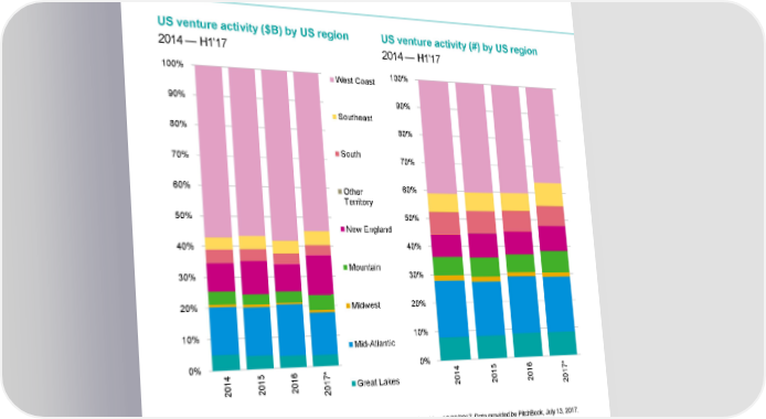 US venture activity ($B) by US region US venture activity (#) by US region 2014 — H1'17 2014 — H1'17 100% 100% West Coast 90% 90% Southeast 80% 80% South 70% 70% 60% 60% Other Territory 50% 50% New England 40% 40% Mountain 30% 30% 20% Midwest 20% 10% 10% Mid-Atlantic 0% 0% 4 5 * 4 5 * 1 1 16 7 1 1 16 7 0 0 1 0 0 1 Great Lakes 2 2 20 0 2 2 20 0 2 2 Source: Venture Pulse, Q2'17, Global Analysis of Venture Funding, KPMG Enterprise. *As of 6/30/2017. Data provided by PitchBook, July 13, 2017. © 2017 KPMG International Cooperative (“KPMG International”). KPMG International provides no client services and is a Swiss entity with which the independent member firms of the KPMG network are affiliated. #Q2VC