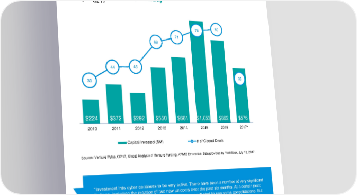 US venture financing in cybersecurity 2010 — Q2'17 78 80 71 66 44 45 38 33 $224 $372 $292 $550 $661 $1,053 $862 $576 2010 2011 2012 2013 2014 2015 2016 2017* Capital Invested ($M) # of Closed Deals Source: Venture Pulse, Q2'17, Global Analysis of Venture Funding, KPMG Enterprise. Data provided by PitchBook, July 13, 2017. “Investment into cyber continues to be very active. There have been a number of very significant findings, including the creation of two new unicorns over the past six months. At a certain point funding in this sector will get overheated and then you will start to see some consolidations. But right now it continues to be a very hot sector.” Brian Hughes Co-Leader, KPMG Enterprise Innovative Startups Network, KPMG International and National Co-Lead Partner, KPMG Venture Capital Practice, KPMG in the US © 2017 KPMG International Cooperative (“KPMG International”). KPMG International provides no client services and is a Swiss entity with which the independent member firms of the KPMG network are affiliated. #Q2VC