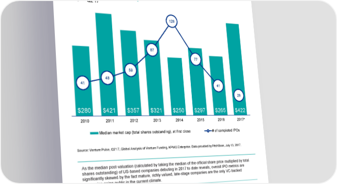 US venture-backed IPO activity 2010 — Q2'17 128 87 77 59 48 41 41 28 $280 $421 $357 $321 $250 $297 $265 $422 2010 2011 2012 2013 2014 2015 2016 2017* Median market cap (total shares outstanding), at first close # of completed IPOs Source: Venture Pulse, Q2'17, Global Analysis of Venture Funding, KPMG Enterprise. Data provided by PitchBook, July 13, 2017. As the median post-valuation (calculated by taking the median of the official share price multiplied by total shares outstanding) of US-based companies debuting in 2017 to date reveals, overall IPO metrics are significantly skewed by the fact mature, richly valued, late-stage companies are the only VC-backed companies going public in the current climate. © 2017 KPMG International Cooperative (“KPMG International”). KPMG International provides no client services and is a Swiss entity with which the independent member firms of the KPMG network are affiliated. #Q2VC