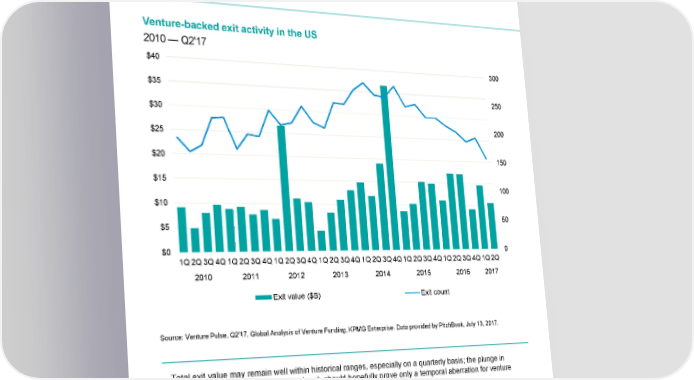 Venture-backed exit activity in the US 2010 — Q2'17 $40 300 $35 250 $30 200 $25 $20 150 $15 100 $10 50 $5 $0 0 1Q2Q3Q4Q1Q2Q3Q4Q1Q2Q3Q4Q1Q2Q3Q4Q1Q2Q3Q4Q1Q2Q3Q4Q1Q2Q3Q4Q1Q2Q 2010 2011 2012 2013 2014 2015 2016 2017 Exit value ($B) Exit count Source: Venture Pulse, Q2'17, Global Analysis of Venture Funding, KPMG Enterprise. Data provided by PitchBook, July 13, 2017. Total exit value may remain well within historical ranges, especially on a quarterly basis; the plunge in completed exit volume, on the other hand, should hopefully prove only a temporal aberration for venture backers. © 2017 KPMG International Cooperative (“KPMG International”). KPMG International provides no client services and is a Swiss entity with which the independent member firms of the KPMG network are affiliated. #Q2VC
